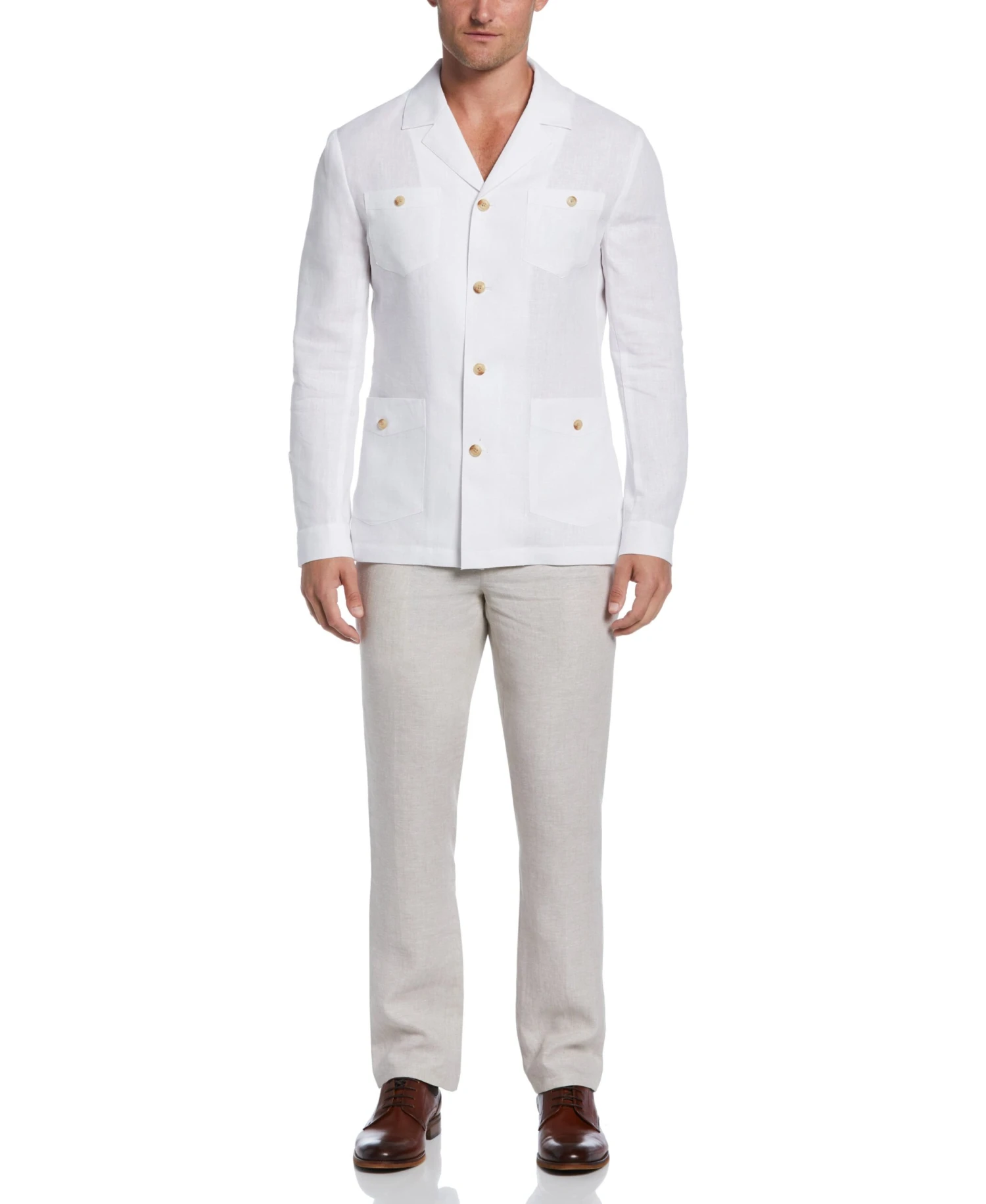 Layer on classic Cuban style with this men’s guayabera jacket from the Cubavera Collection. The 100% washed Delave linen is soft and breathable and features plain weave fabrication for durability. Four buttoned front pockets add plenty of storage space along with distinctive guayabera charm.