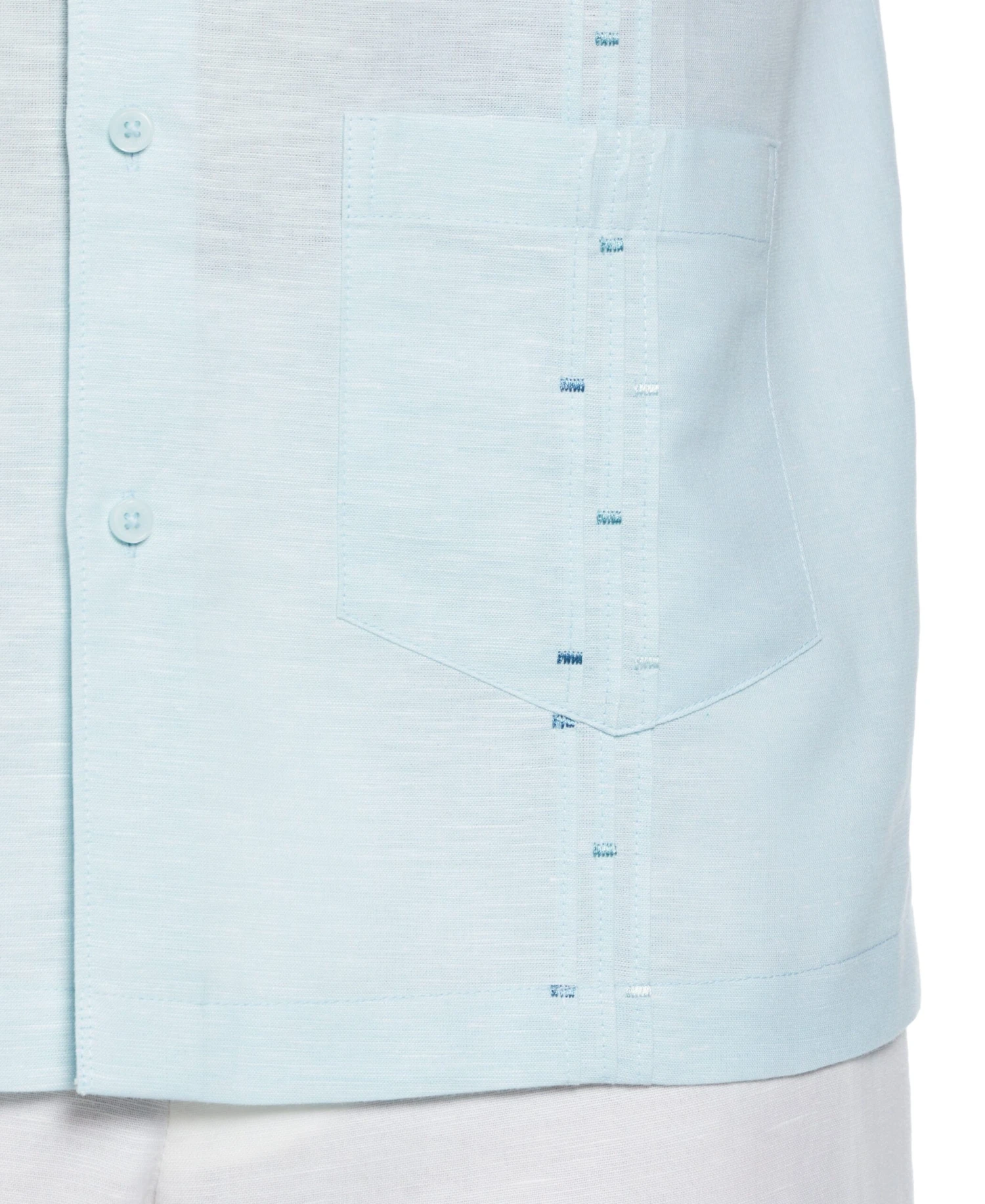 You’re ready for action in this stylish short sleeve button-down shirt from Cubavera. It’s crafted from a lightweight and breathable linen-cotton blend in a durable double weave for lasting comfort. Four-pocket styling, pintuck detailing and vertical embroidered pleats give this men’s short sleeve guayabera shirt extra flair. Finished with a point collar, this versatile shirt takes you from casual to formal occasions with ease.