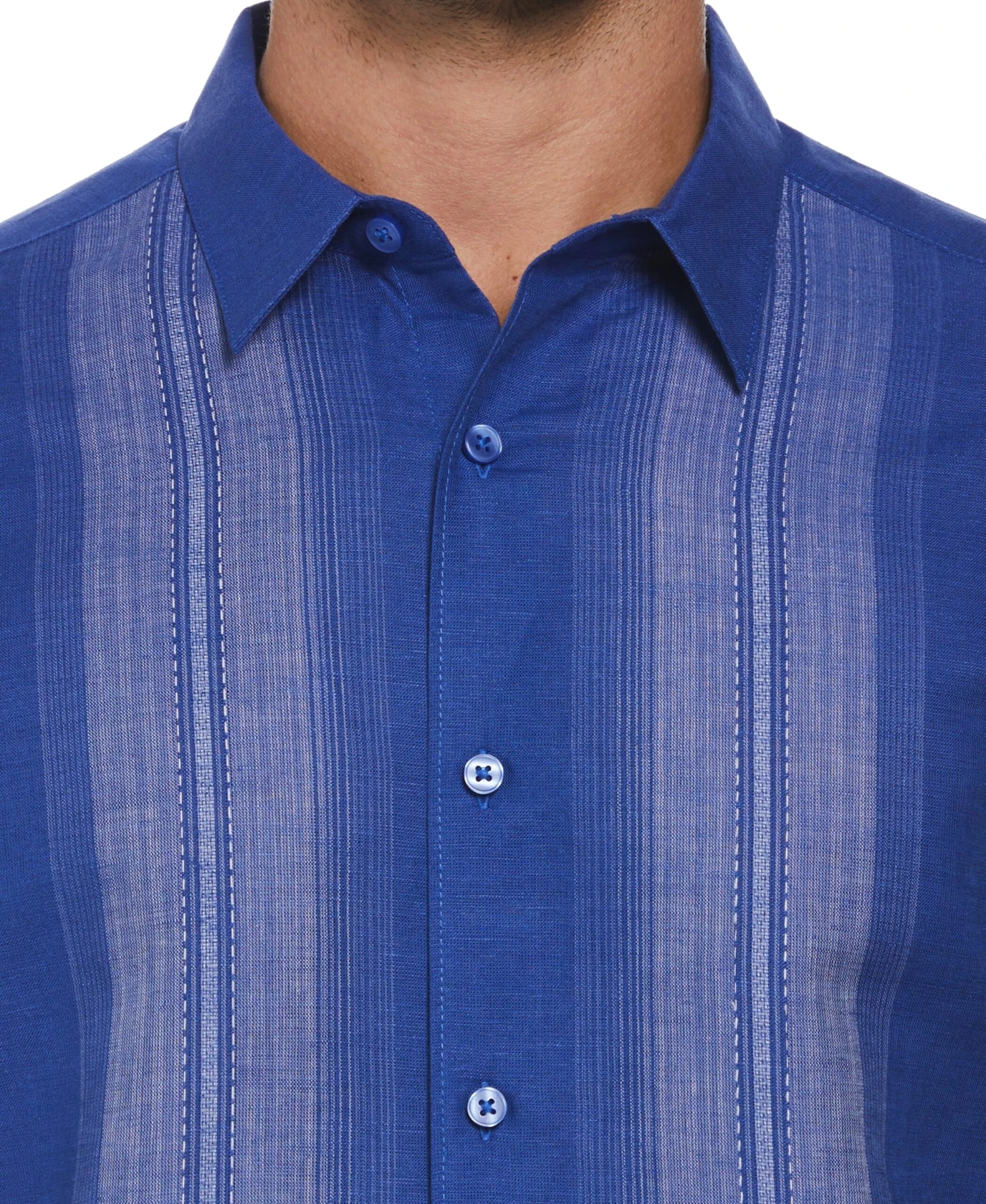 Made from a soft, breathable linen-cotton blend fabric, this Cubavera men’s short sleeve button-down shirt is designed for cool comfort in the warmer months. The durable plain weave fabric is machine washable, making it a practical option for day-to-day errands, relaxing poolside, and everything in-between. Yarn dyed contrast stripes form an L shape down the front for casual style, while the dobby fabrication weaves raised geometric patterns into the surface for a sophisticated touch of texture. The design is finished with a sharp point collar and rolled cuffs for a clean, put-together look.