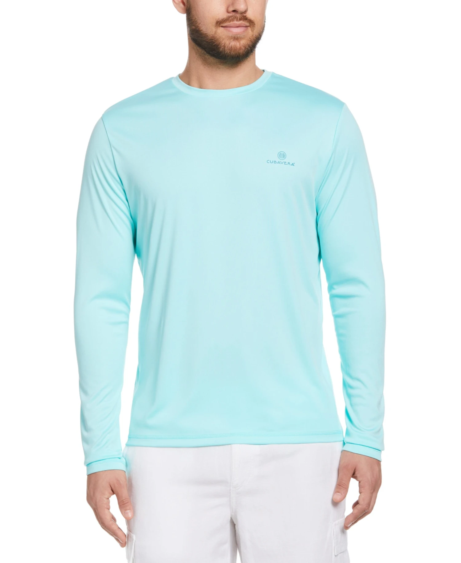 Prepare for sunny days ahead with this practical men’s long sleeve shirt from Cubavera. Designed to help protect against damaging UV rays, this crew neck shirt offers plenty of coverage and smooth, durable double knit fabric. The material offers a comfortable hint of stretch, and it wicks away moisture to help keep you dry in hot and humid weather. A graphic print on the back featuring a pineapple brings a laidback vibe to the design and the neck is tagless for added comfort.