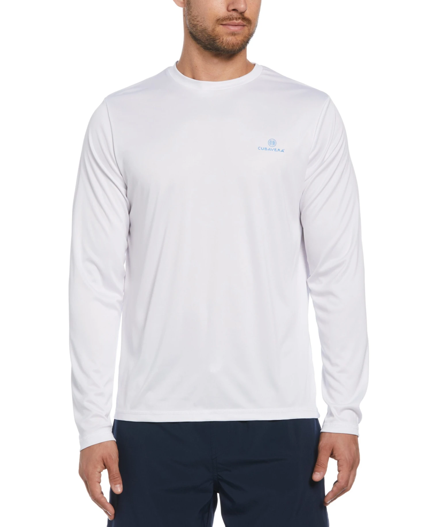 Bring on the sun in this Cubavera men’s long sleeve shirt. A Varadero Cuba print on the back pops with cool tropical flair that is sure to turn heads. The double-knit fabric contains added stretch for a fit that moves with you and moisture-wicking properties keeps you feeling cool and comfortable. This crew neck shirt offers innovative sun protection from damaging UV rays so you can soak up the sun safely. Pair it with your favorite Cubavera pants or shorts for a cool, casual look that has you covered.